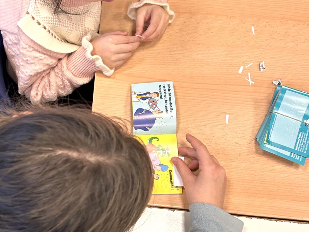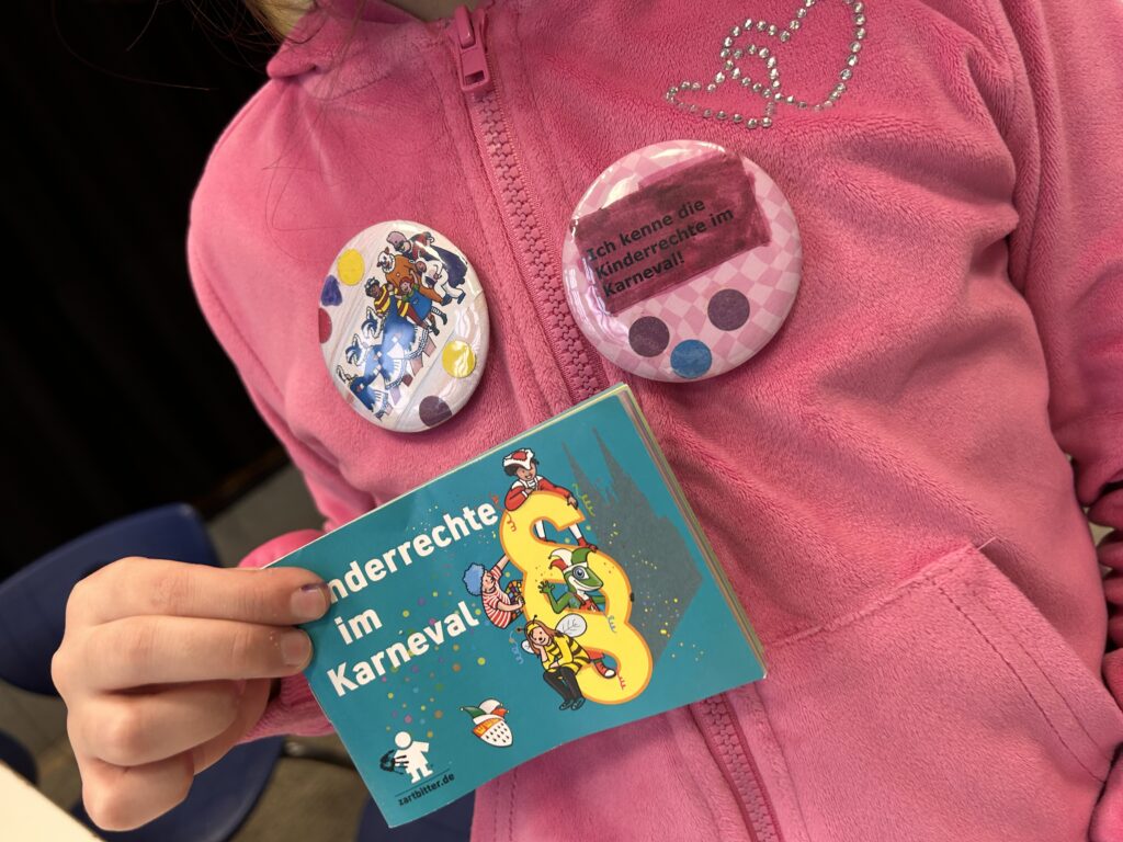 Ziel ist, dass sich die Kinder mit ihren Rechten – insbesondere in der jecken 5. Jahreszeit – beschäftigen und sie altersgerecht darüber aufzuklären und zu stärken, damit sie sich sicher in der Karnevalszeit bewegen und feiern können. Dabei helfen die Viertklässler:innen den jüngeren Pänz und berichten ihnen von den Kinderrechten in ihrer Muttersprache – das fördert Zusammenhalt und das Miteinander an der Schule. Und es ist nach wenigen Tagen schon toll zu sehen, wie die „Großen“ den „Kleinen“ in eigener Sprache davon berichten. Täglich gibt es nach der fleißigen Beschäftigung mit ihren Rechten noch ein besonderes Highlight: Die Kids dürfen sich einen Button mit dem Kinderrecht erstellen, das ihnen besonders wichtig ist.